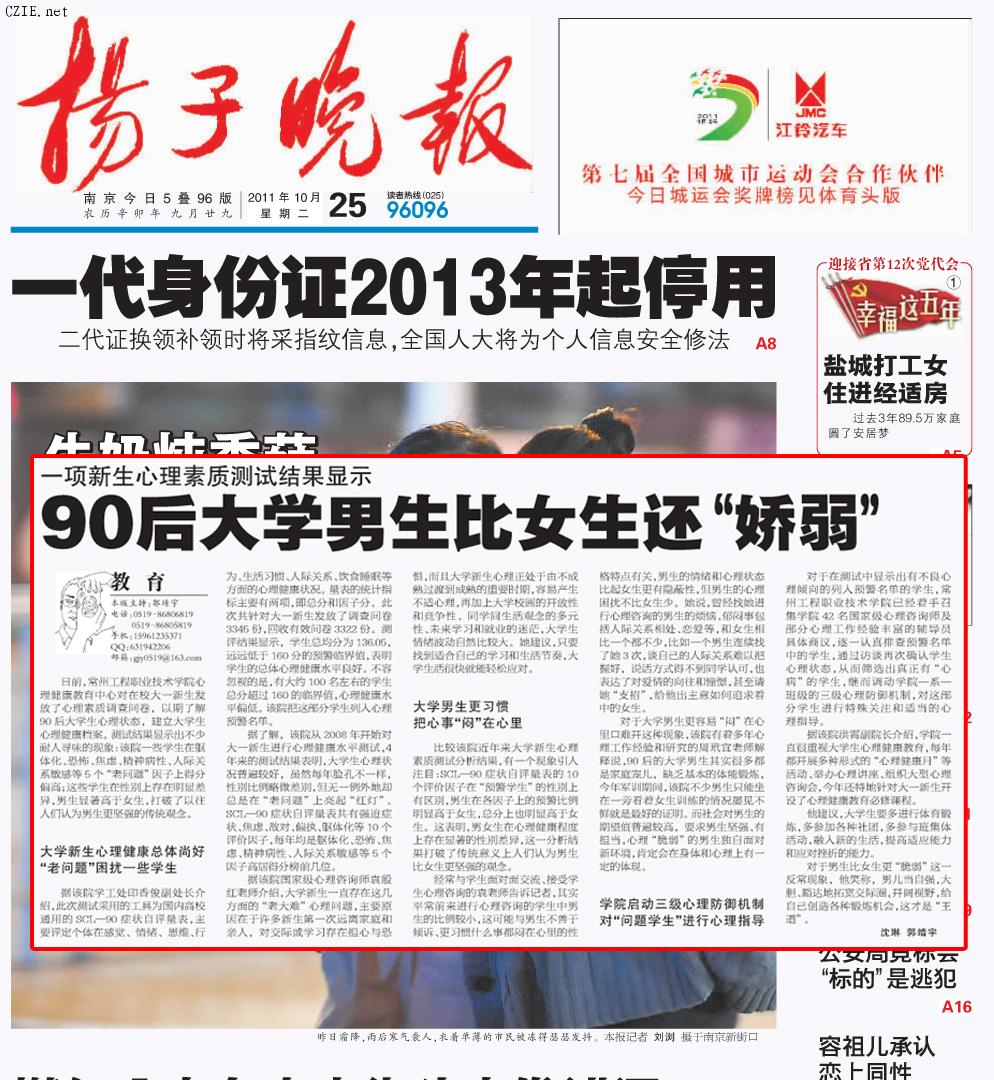 对于男生比女生更“脆弱”这一反常现象,他笑称,男儿当自强,大胆、豁达地拓宽交际圈,开阔视野,给自己创造各种锻炼机会,这才是“王道”。 (沈琳 郭靖宇)