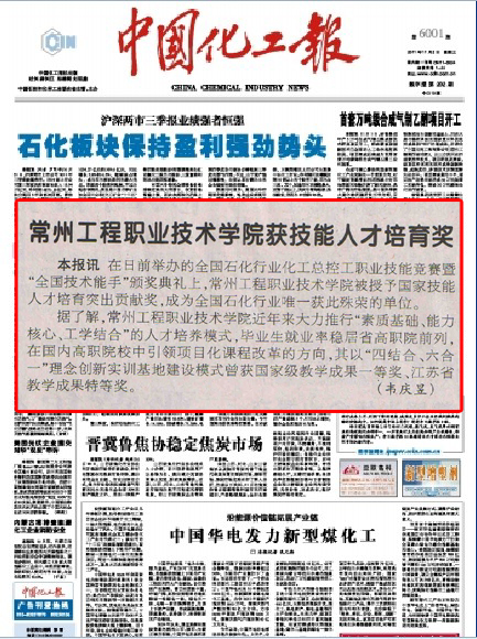 常州工程职业技术学院获技能人才培育奖(《中国化工报》2011-11-02 B2版)