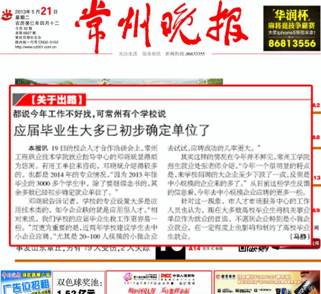 《常州晚报》:应届毕业生大多已初步确定单位了 (2013-5-21 A2版)