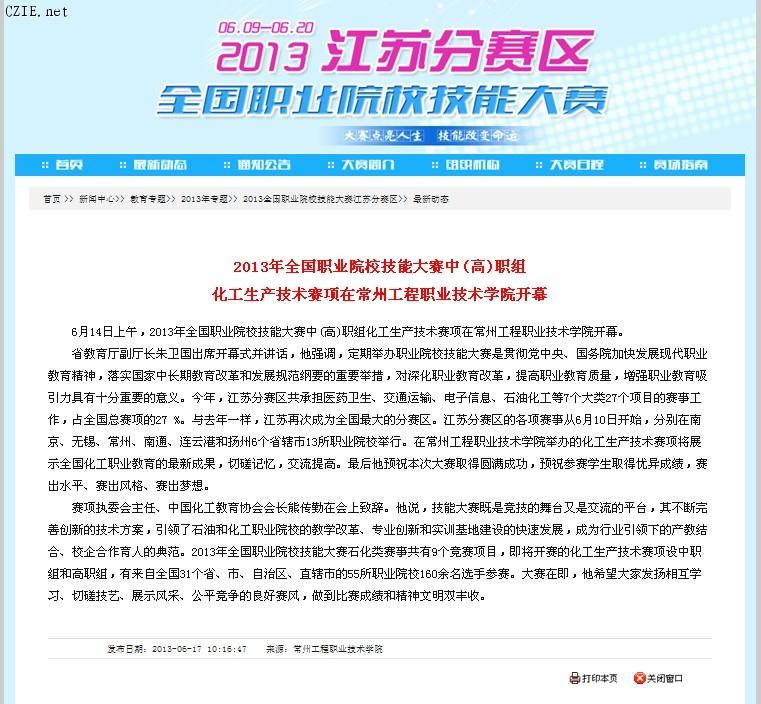 6月14日上午,2013年全国职业院校技能大赛中(高)职组化工生产技术赛项在常州工程职业技术学院开幕。