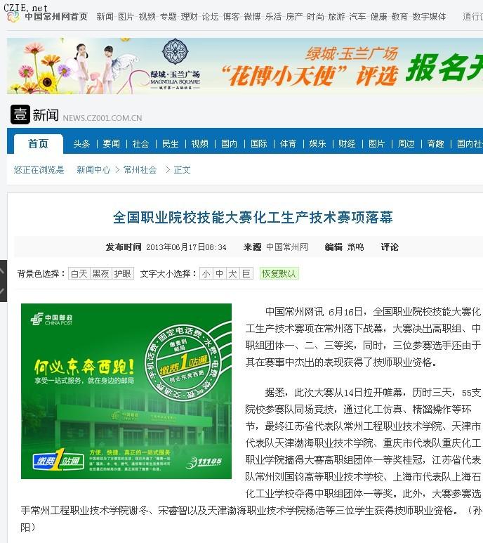 《中国常州网》:全国职业院校技能大赛化工生产技术赛项落幕(2013-6-17)