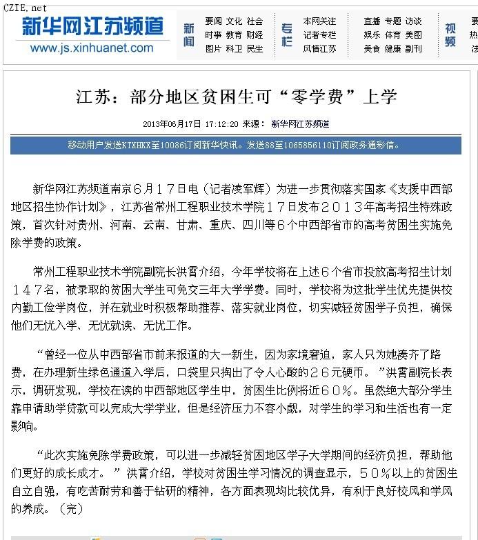 新华网江苏频道南京6月17日电(记者凌军辉)为进一步贯彻落实国家《支援中西部地区招生协作计划》,江苏省常州工程职业技术学院17日发布2013年高考招生特殊政策,首次针对贵州、河南、云南、甘肃、重庆、四川等6个中西部省市的高考贫困生实施免除学费的政策。