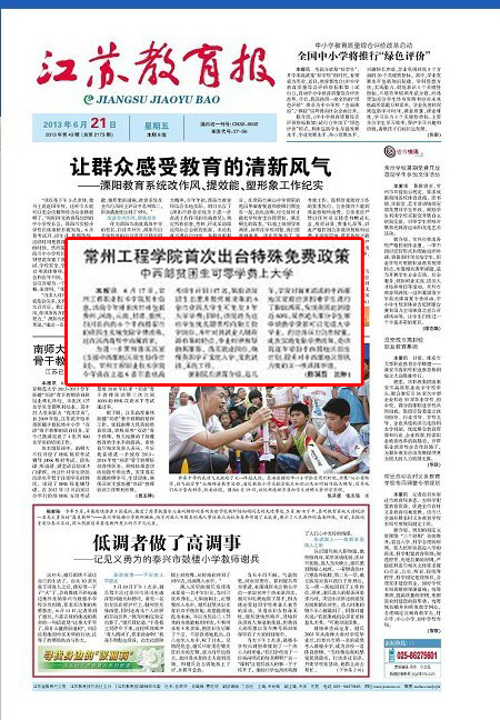 《江苏教育报》:常州工程学院首次出台特殊免费政策(2013-6-21 A2版)