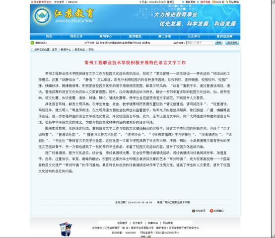 常州工程职业技术学院将语言文字工作与校园文化活动有机结合,形成了“常态管理——动态培训——特色活动”相结合的工作模式。注重“动静结合”,“静者” 文以载道,即充分利用校园内的各种宣传园地,如报刊栏、宣传橱窗、校报校刊、校园广播、横幅标语、微博微信等,积极营造校园文化中的用字用语规范氛围,彰显文明风尚;“动者”寓教于乐,通过普通话培训、测试,营造深厚的语言文化知识和人文教育氛围。同时,以经典诵读活动为特色,融合一系列丰富多彩的校园文化活动,如:读书活动、征文比赛、知识竞赛、演讲、朗诵、辩论、诵读比赛等,使学生自觉接受语言文字规范,不断提升人文素质。