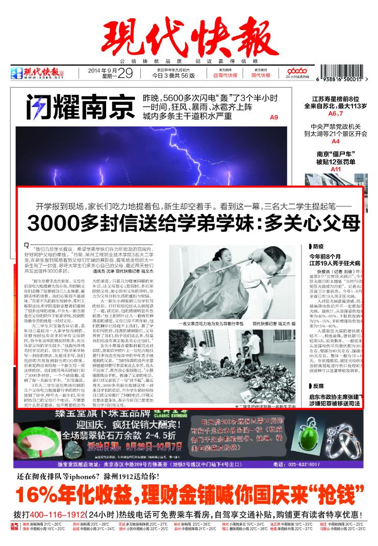 9月29日,《现代快报》以将近三分之一的版面对学校三位大二迎新志愿者给大一新生发放3000多封信,提醒新生多关心父母的事件进行了报道。