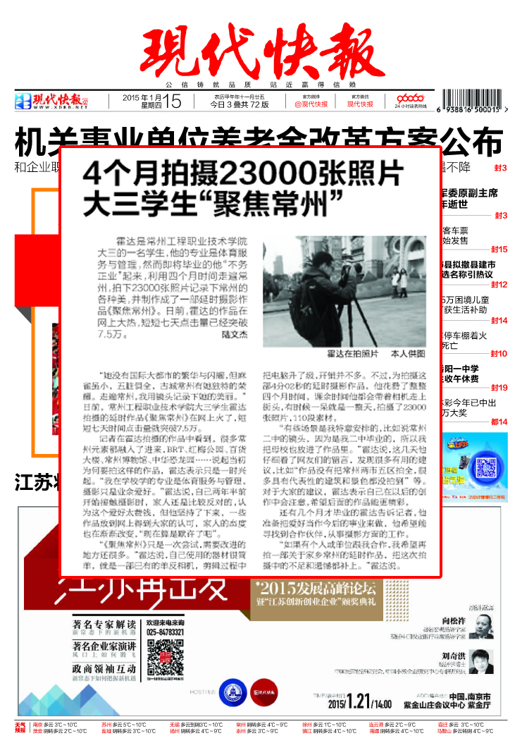 霍达是常州工程职业技术学院大三的一名学生,他的专业是体育服务与管理,然而即将毕业的他“不务正业”起来,利用四个月时间走遍常州,拍下23000张照片记录下常州的各种美,并制作成了一部延时摄影作品《聚焦常州》。日前,霍达的作品在网上大热,短短七天点击量已经突破7.5万。