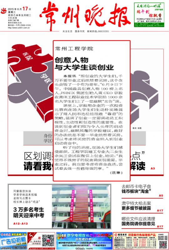 《常州晚报》:常州工程学院创意人物与大学生谈创业 (2015-6-17)