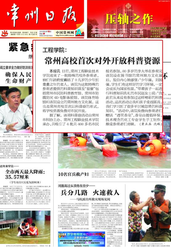 《常州日报》:工程学院:常州高校首次对外开放科普资源(2015-6-18)