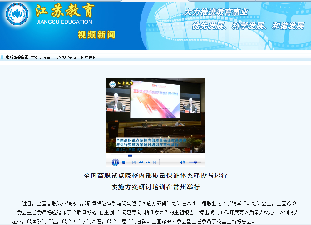 江苏教育网:全国高职试点院校内部质量保证体系建设与运行实施方案研讨培训在常州举行(2016-11-1)