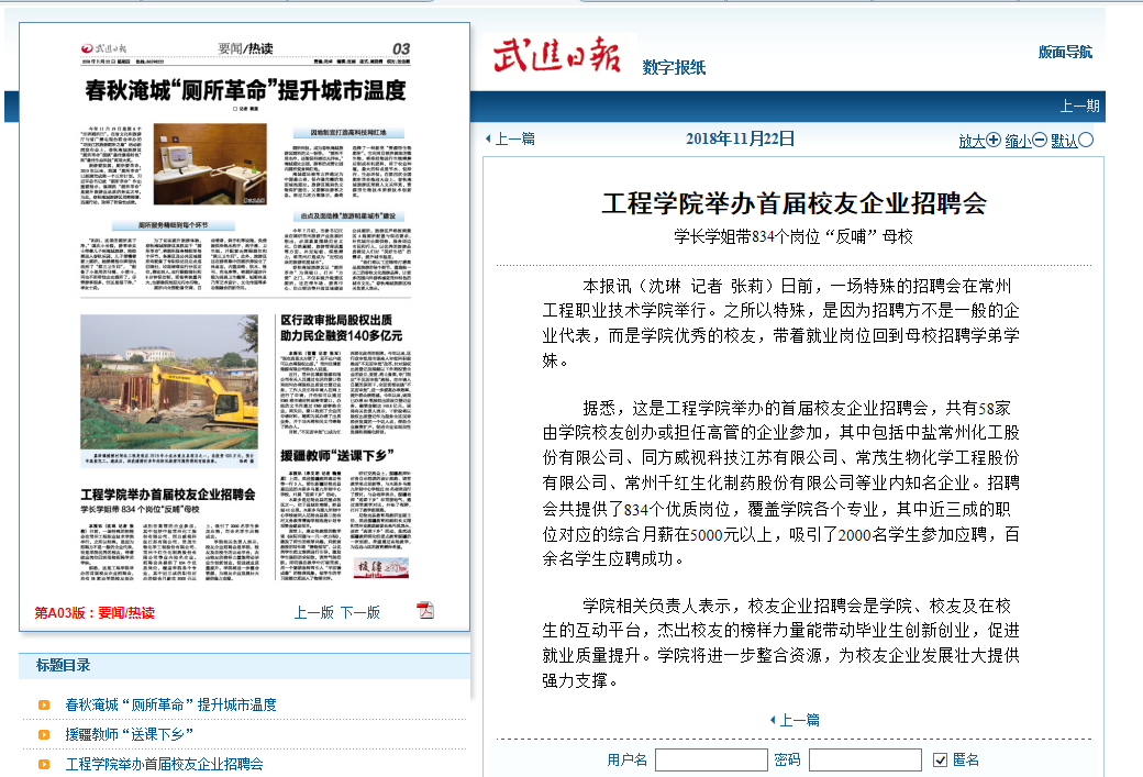 《武进日报》:工程学院举办首届校友企业招聘会 (2018-11-22)