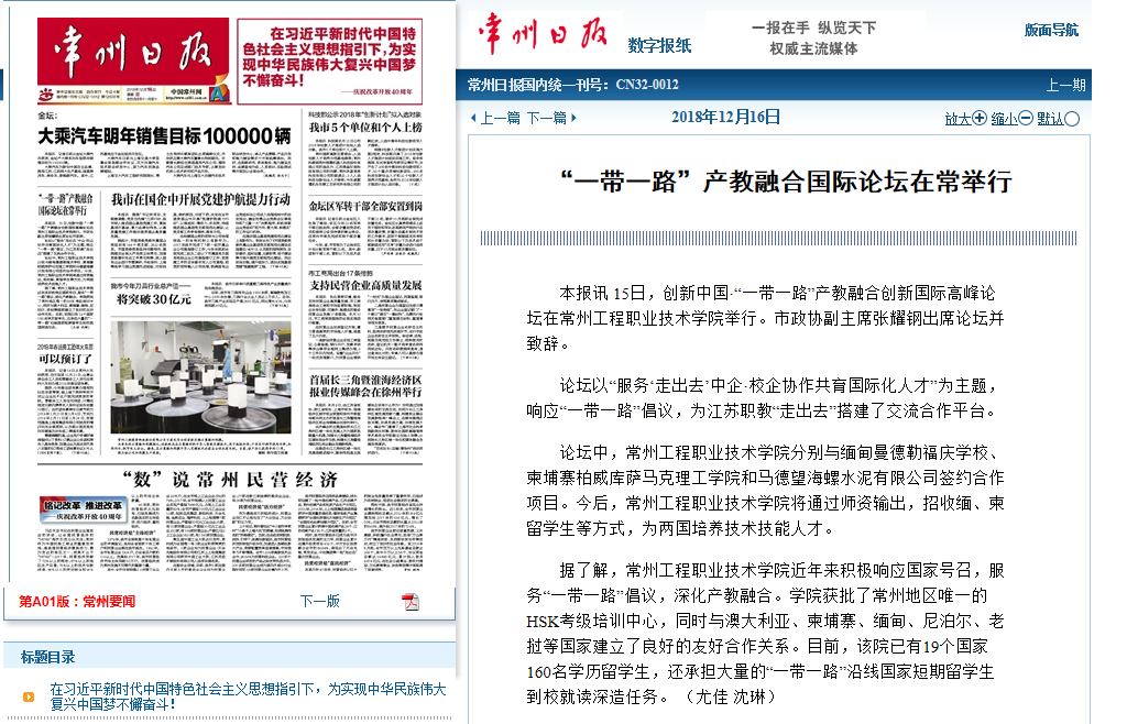 《常州日报》:“一带一路”产教融合国际论坛在常举行(2018-12-16)