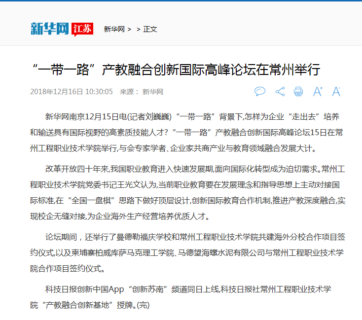 新华网:“一带一路”产教融合创新国际高峰论坛在常州举行(2018-12-15)