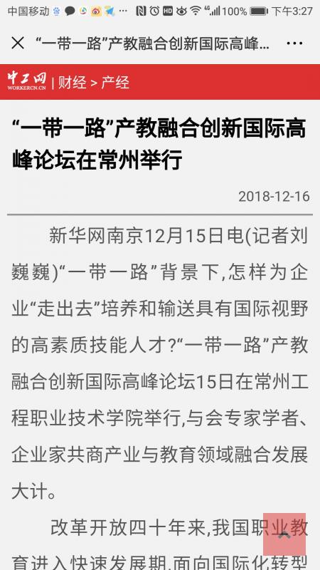 中工网:“一带一路”产教融合创新国际高峰论坛在常州举行(2018-12-16)