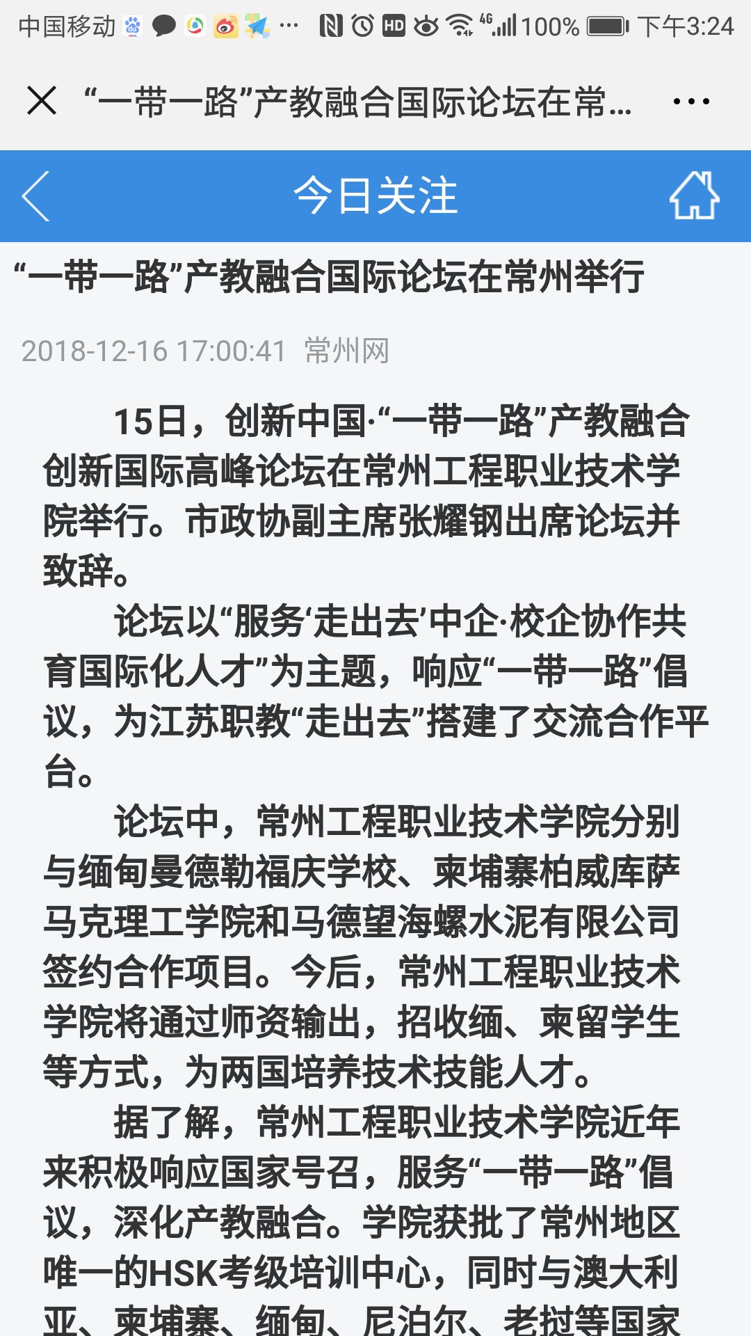中国常州网:“一带一路”产教融合国际论坛在常州举行(2018-12-16)