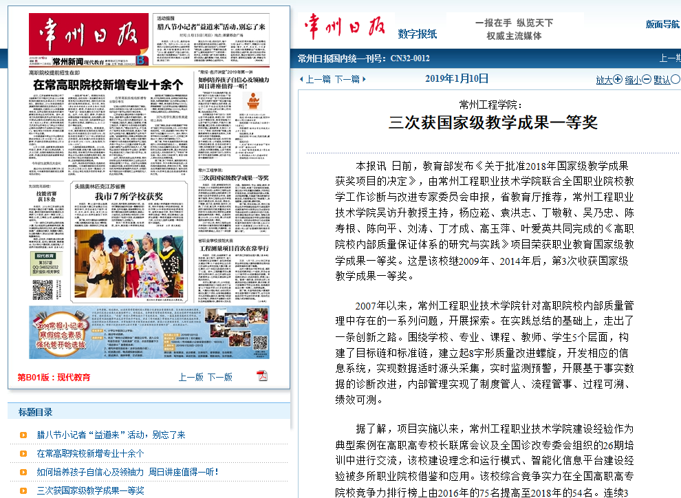 据了解,项目实施以来,常州工程职业技术学院建设经验作为典型案例在高职高专校长联席会议及全国诊改专委会组织的26期培训中进行交流,该校建设理念和运行模式、智能化信息平台建设经验被多所职业院校借鉴和应用。该校综合竞争实力在全国高职高专院校竞争力排行榜上由2016年的75名提高至2018年的54名。连续3年入选“全国高职院校服务贡献50强”。 (雷宁 沈琳)
